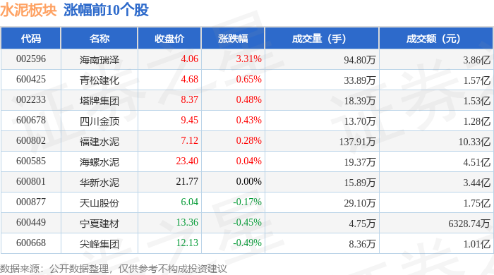 证券之星音讯,10月29日水泥板块较上一交易日跌落0.41%,国统股份领跌。当日上证指数报收于4016.33,上涨0.7%。深证成指报收于13691.38,上涨1.95%。水泥板块个股涨跌见下表:
