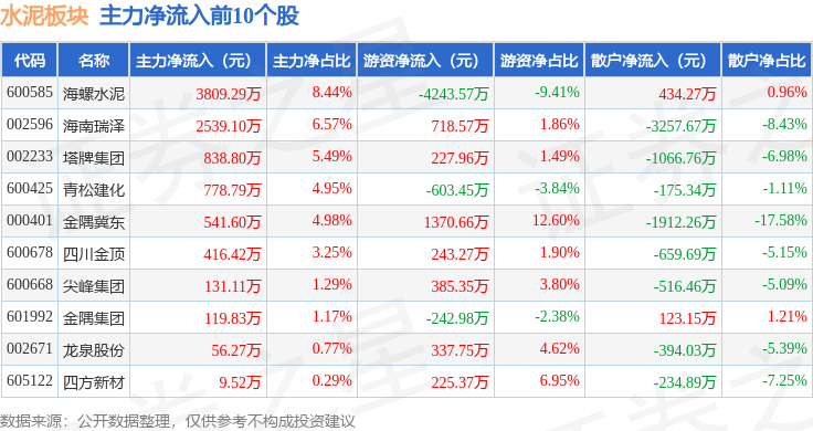 从资金流向上来看,当日水泥板块主力资金净流出1.58亿元,游资资金净流出1485.11万元,散户资金净流入1.72亿元。水泥板块个股资金流向见下表: