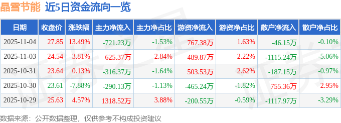 证券之星音讯,到2025年11月4日收盘,晶雪节能(301010)报收于27.85元,上涨13.49%,换手率16.44%,成交量17.76万手,成交额4.71亿元。